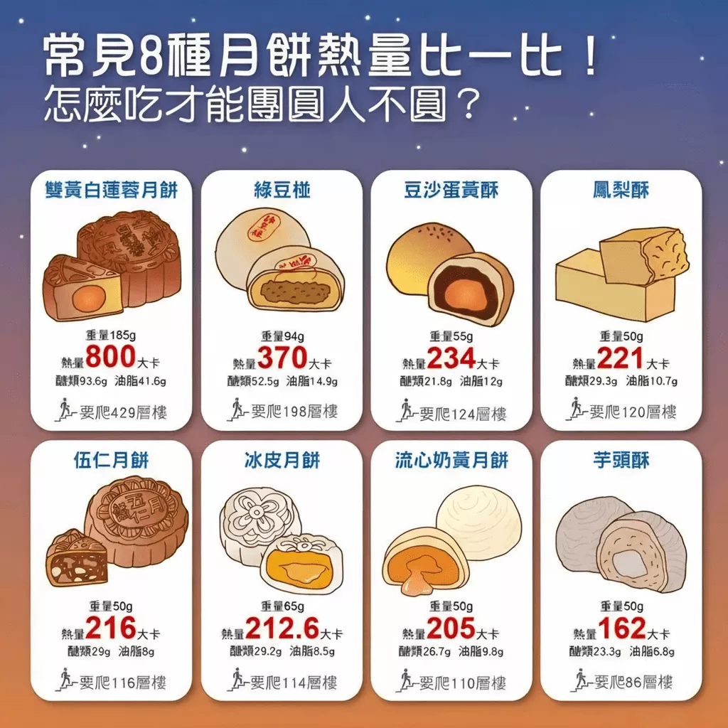 無論是團圓還是美味,中秋月圓人要瘦,吃前不妨看看這份熱量表,更聰明地享受月餅吧!